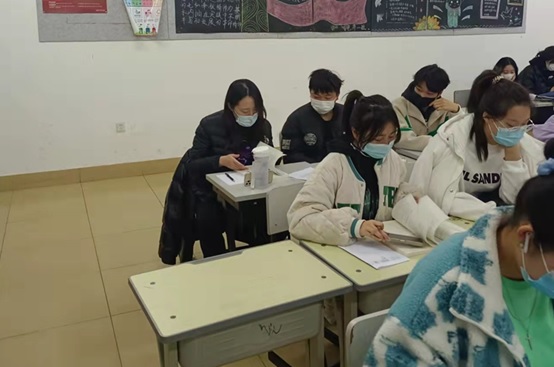 ▲王晶莹在听课与同学们一起讨论专业所学内容