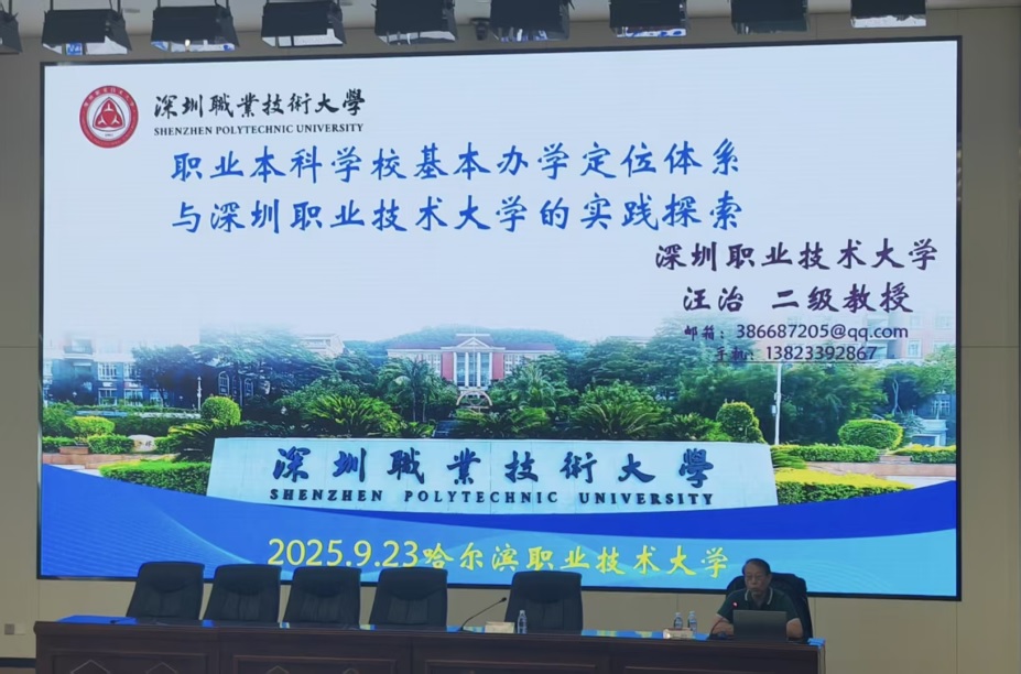 汪治教授以通俗易懂的语言和贴近实际的案例,围绕“增强职业教育适应性”这一核心,从类型、层次、功能等八大维度系统解析了职业本科办学定位体系。他结合深职大与比亚迪等企业联合共建的43个校企联合研发中心、三段式小学期实战体系等案例,深入浅出地分享了深职大在实践路径方面的探索经验,为我校职业本科建设提供了宝贵参考。