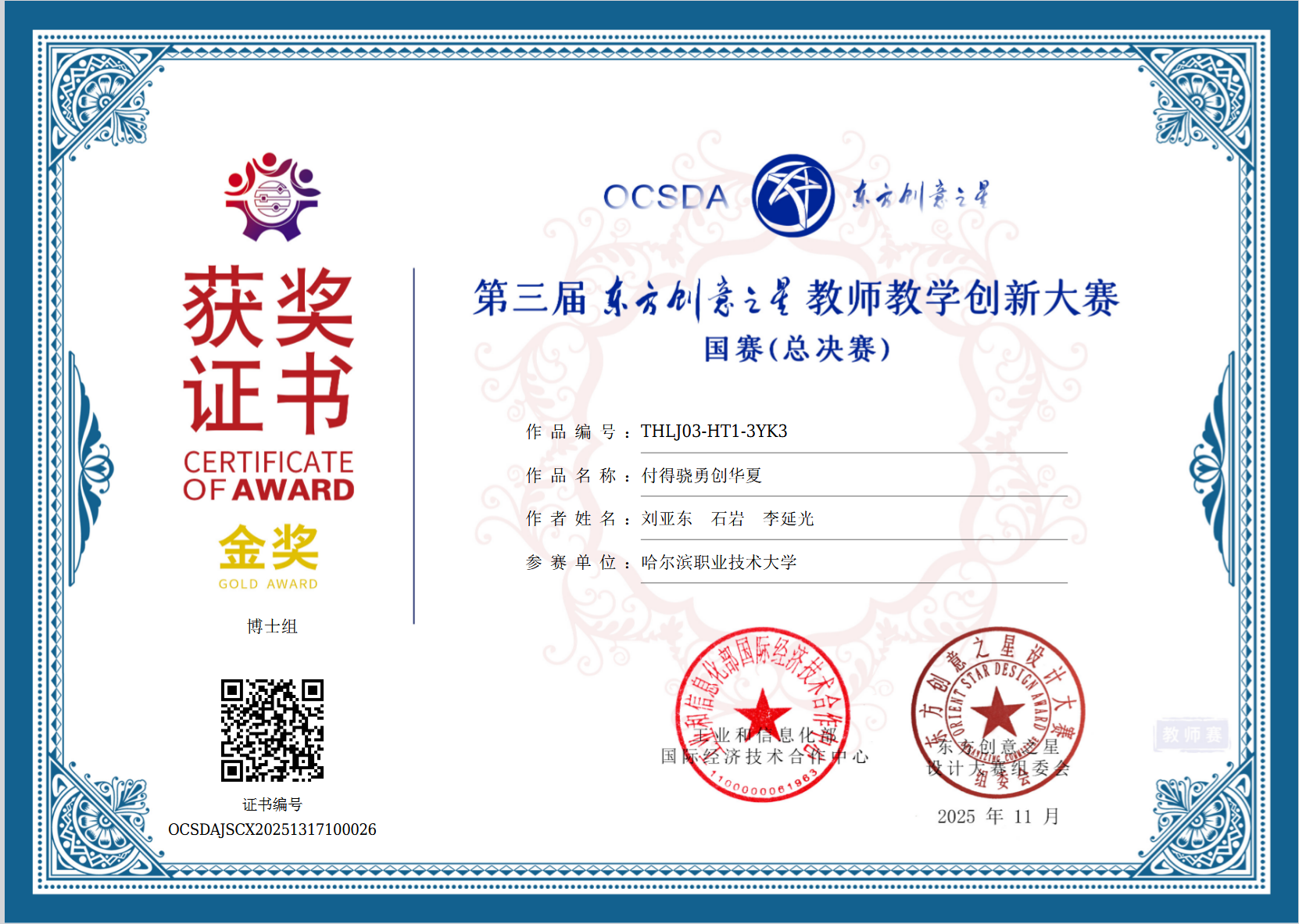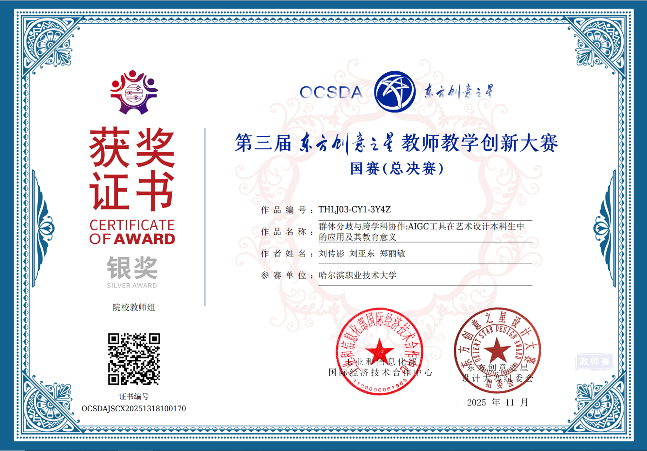 近日,2025第三届东方创意之星教师教学创新大赛(教师赛)全国总决赛在江苏大学落幕。哈尔滨职业技术大学数字科技与艺术学院教师刘亚东、石岩、李延光团队荣获金奖,刘传影、刘亚东团队荣获银奖,为学校赢得荣誉。
