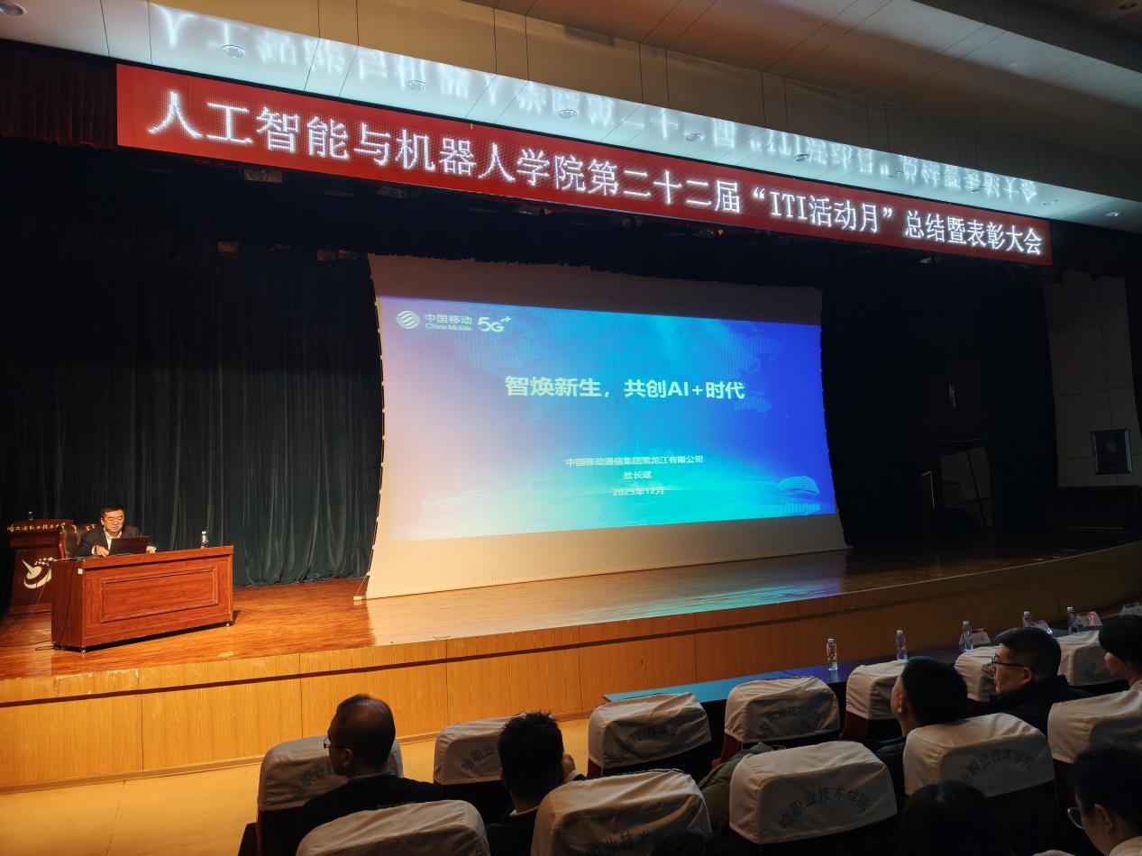 大会特别邀请中国移动通信集团黑龙江有限公司政企解决方案经理、龙江“数字工匠”杜长斌,作题为“智焕新生,共创AI+时代”的主题报告。报告结合行业前沿案例,深入解析了人工智能发展情况与中国AI算力的网络布局,为师生们带来了一场兼具专业性与前瞻性的行业分享。