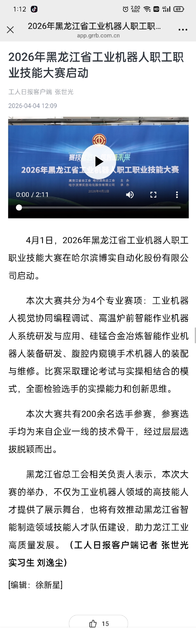 工人日报:2026年黑龙江省工业机器人职工职业技能大赛启动