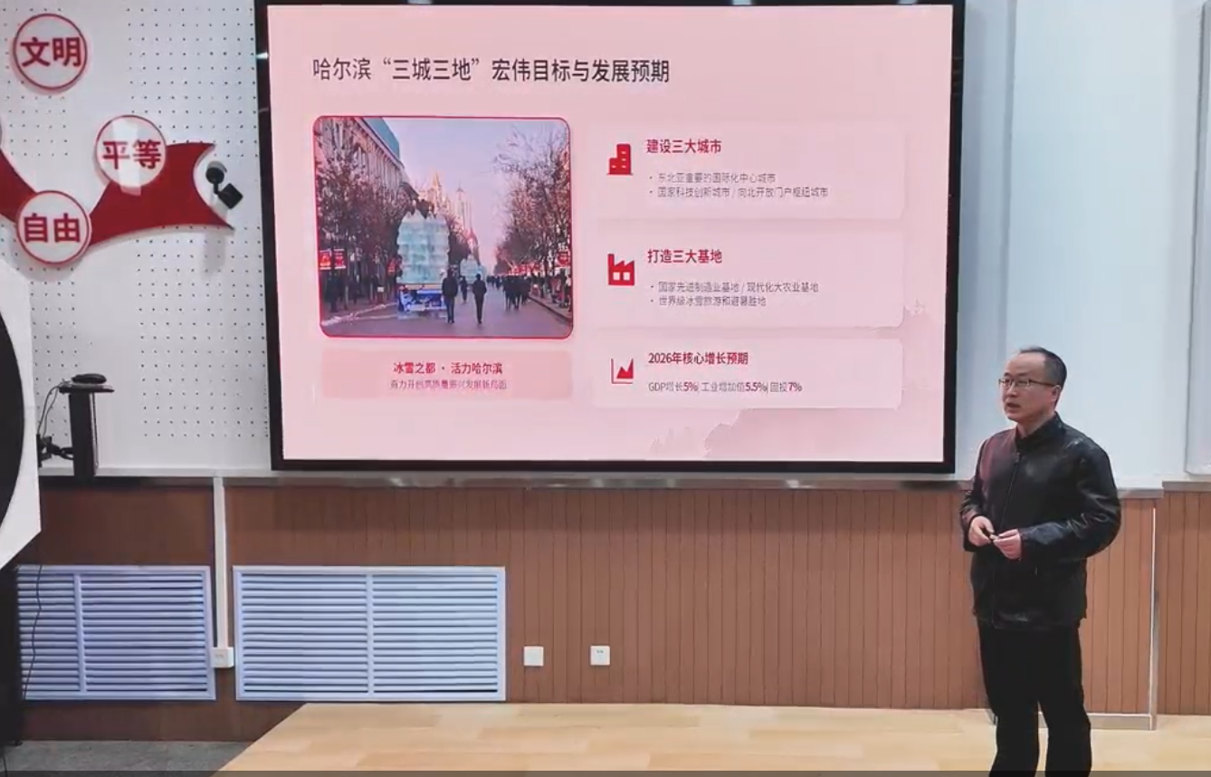 4月22日,学校举办“纪念哈尔滨解放80周年——从共和国长子到新时代振兴先锋”专题讲座。马克思主义学院教授韩刚依托翔实史料,系统梳理哈尔滨解放历程、历史贡献与建设成就,深入阐释城市红色底蕴,激励青年学子将个人成长与城市发展紧密相连,在哈尔滨“三城三地”建设征程中贡献青春力量。