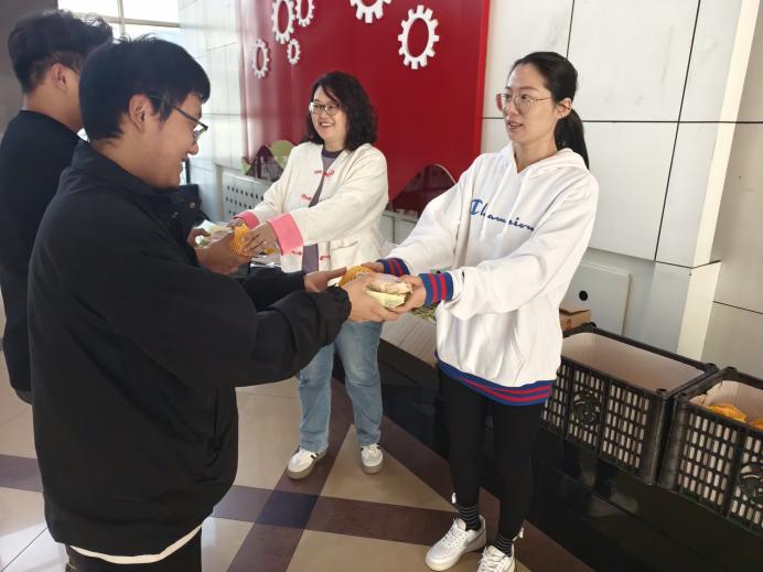 上午9点,人工智能与机器人学院的志愿者们在李娜娜老师的带领下将一箱箱的月饼和苹果小心搬运到学院的发放场地,并及时通知到每一位假期留校的学生,认真做好发放准备工作。