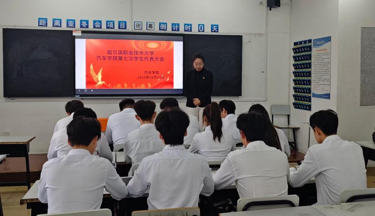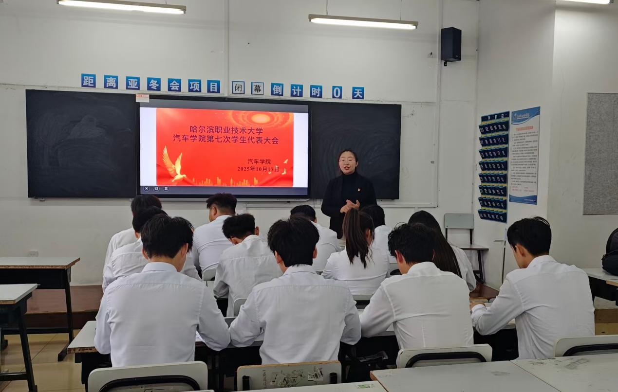 2025年10月17日,在1号教学楼124教室,汽车学院召开了第七次学生代表大会,团总支书记贺亚京老师出席会议。第六届学生会主席赵秋浩、团总支副书记王泓烨、副主席张湛嵩、23级新能源2班(悉尼)班长杨佳鑫,以及第七次学代会全体代表参加会议。