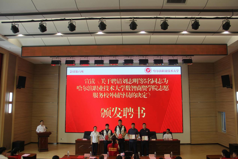 数智商贸学院党总支副书记历炳媛宣读《关于聘任刘志明等6名同志为哈尔滨职业技术大学数智商贸学院志愿服务校外辅导员的决定》并颁发《聘书》。
