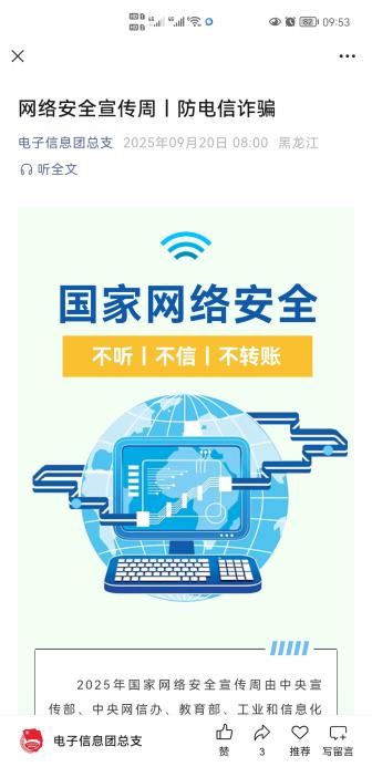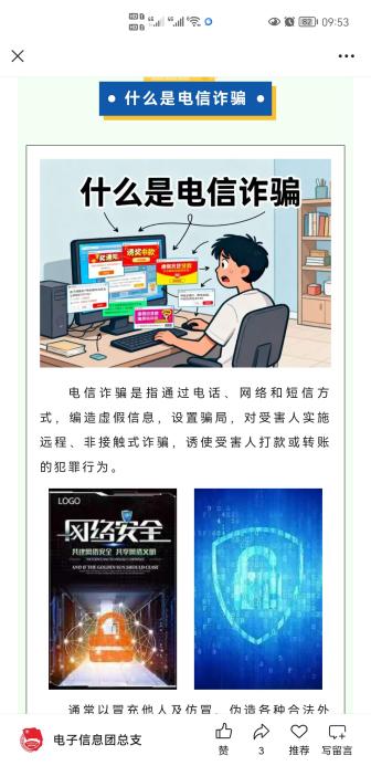 1.开展线上线下宣传工作。利用二级学院公众号开启本次家网络安全教育宣传活动,组织广大师生通过“公安部刑侦局”“国家反诈中心”“央视频”微博、微信视频号、快手、抖音账号等观看“大中小学生反诈大课堂”,学习掌握防范电信诈骗、个人信息保护、规范网络行为等方面。通过观看直播视频进一步提高了同学们对网络诈骗的防范、鉴别和自我保护能力,认识到诈骗的多样性和隐蔽性,使广大学子了解了各类诈骗惯用招数和应对方法,引导同学们为筑牢安全的反诈防线贡献自己的力量。