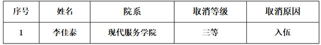经公示期内审核,有1名学生发生学籍异动,根据《哈尔滨职业技术大学国家助学金评定办法》第十二条第(八)款,拟取消以下学生2025-2026学年国家助学金受助资格,现予以公示,公示时间为2025年10月28日-10月30日。