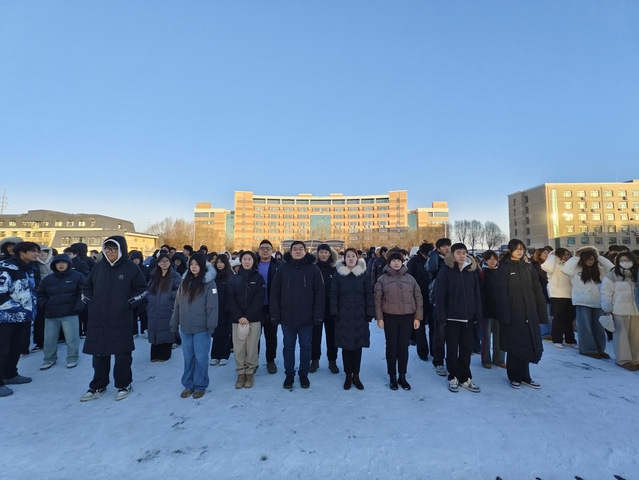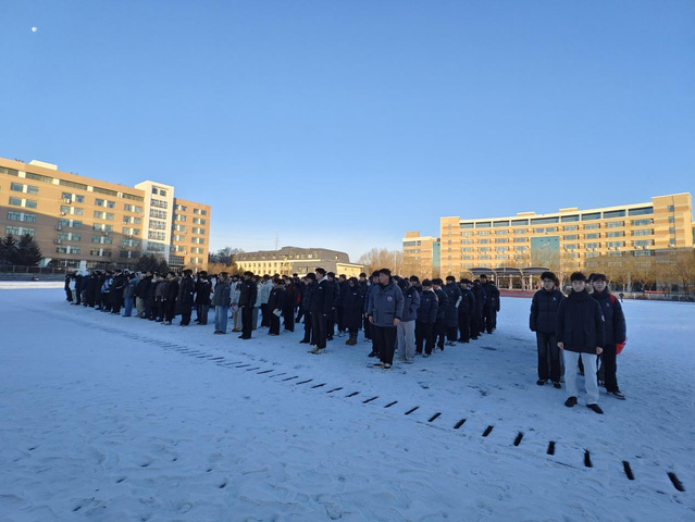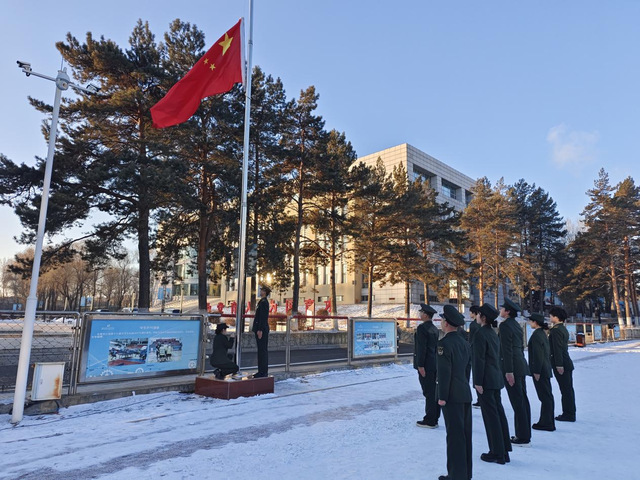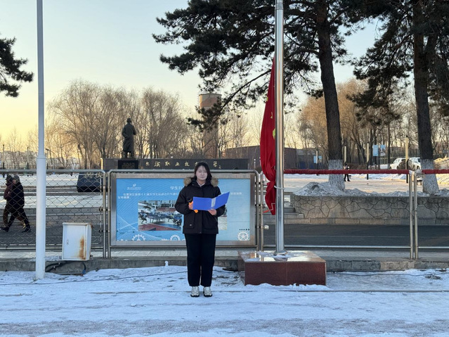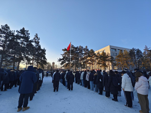 晨曦微露,寒意渐浓,全体人员身着正装,神情肃穆。伴随着铿锵有力的《义勇军进行曲》,五星红旗在护旗手的护送下冉冉升起,在场师生齐声高唱国歌,目光追随着国旗升至杆顶,爱国情怀在晨光中激荡。